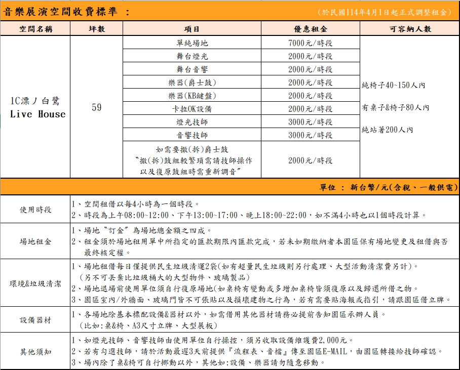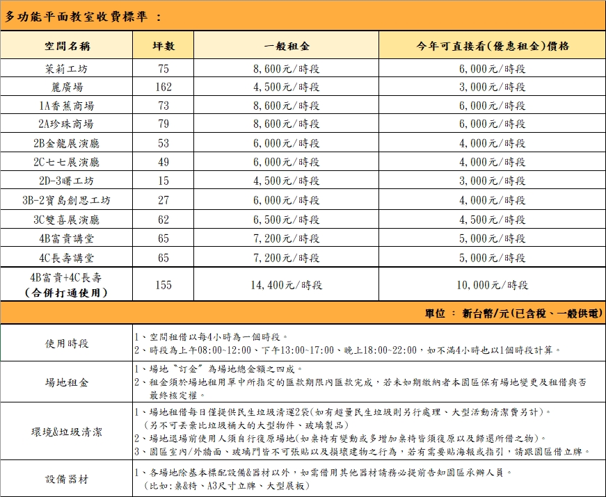 如借用麗廣場辦理【音樂活動】收費則為9,000元/時段。